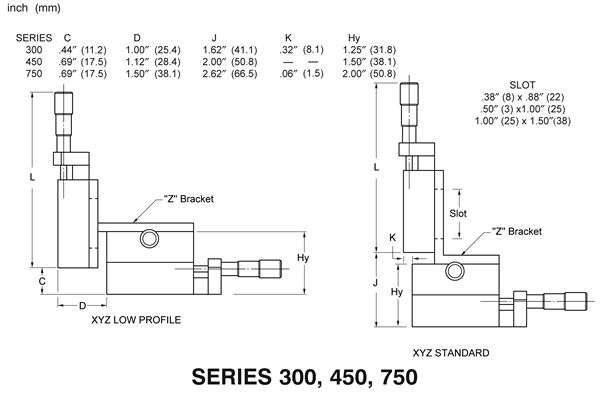 | Model | Price | Travel | Load Capacity X (lbs) | Load Capacity XY (lbs) | Load Capacity Z (lbs) | Work Surface A x B | L | Hx | W | Through Hole | Accuracy (in/in of travel) |